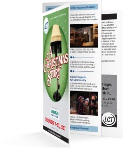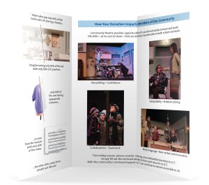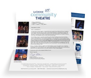 The first phase of the fundraising campaign was a direct mail campaign to existing customers and donors. The mailing including a letter with engaging, color photos from past season’s holiday shows, an insert outlining the cost of producing theatre on one side and a donation form on the reverse side. Each board member selected several patrons they knew personally from the mailing list and included a brief, personal note.